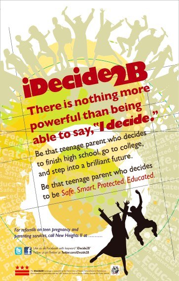 The iDecide2B Campaign is a multi-media initiative for pregnant and parenting teens in Washington, DC. Promoting the messages to the target audience to finish high school and continue their education, the campaign is grounded in a theme of self empowerment and responsibility while encouraging pregnant and parenting teens to decide to be Safe, Smart, Educated and Protected.