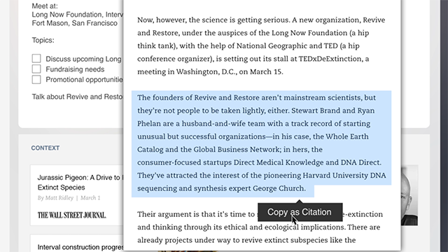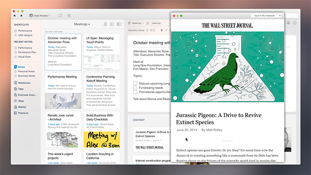 Context displays information immediately relevant to work as it’s being done in Evernote. The new feature dynamically shows related past work, information a colleague may have on the topic, and soon, contextually relevant, recent articles from outlets and services such as The Wall Street Journal, Fast Company, TechCrunch, CrunchBase, Inc. Magazine, LinkedIn, and others. For teams using Evernote Business, content from Factiva, the Dow Jones premium media aggregation service, will also be displayed.