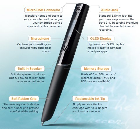 The Echo smartpen is a computer in a pen that records everything you hear and links it to what you write, so you never miss a word. Listen to recorded audio by tapping on your notes. Upload your notes and audio you captured with Echo to your computer to search for words or share your notes and recordings online.