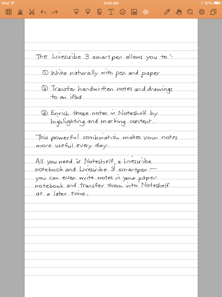 Once in Noteshelf users can make their notes even more useful with a wide variety of tools. Noteshelf is the latest app to leverage Livescribe’s mobile SDK incorporating native handwriting support.should update their copy of Noteshelf to version 9.0, then go into the Noteshelf Store while connected to the Internet, and select the free Livescribe Sync Pack to add support for their Livescribe 3 smartpen. Once installed, customers tap the smartpen icon to add their handwriting to Noteshelf.