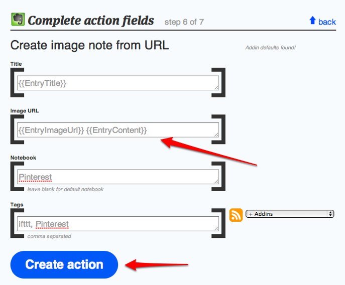 5. You can then customize your note further by adding Addins. Adding the {{EntryContent}} Addin will allow for a copy of the image in addition to the image url. If you don’t want to add a copy of the image in your Evernote however, say you need to save on space for example, just leave {{EntryImageUrl}} on the “Image Url” line. Choose your notebook on Evernote. Make sure to add the notebook first if it doesn’t already exist, add some tags if you desire, and press ‘update.’/